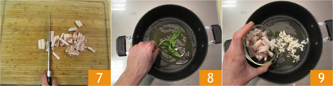 Nun kümmern Sie sich um den Schinken, schneiden Sie ihn einfach in dünne Streifen 7. In einem breiten Topf mit hohem Rand geben Sie einen Schuss Öl hinein, erhitzen es und fügen einen Zweig Basilikum hinzu (die Blätter benötigen Sie später) 8, sowie den Speck und den Schinken 9.