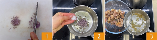 Um die Nudeln mit Kastanien und Parmesan-Fondue zuzubereiten, schälen und hacken Sie zuerst die Schalotte fein 1, dann geben Sie sie in einen kleinen Topf mit einem Spritzer Öl und einer Prise Salz 2; lassen Sie sie sanft bei niedriger Hitze etwa 5 Minuten köcheln, ab und zu umrühren, damit sie nicht zu stark bräunt. Wenn sie weich und durchscheinend ist, fügen Sie die vorgekochten Kastanien hinzu 3, und braten Sie sie zusammen mit der Schalotte für einige Minuten gut an.