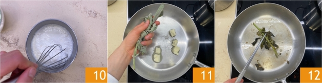 Rühren Sie mit einem Schneebesen, bis der Käse vollständig geschmolzen ist und Sie eine flüssige und glänzende Creme haben 10. In der Zwischenzeit lassen Sie in einer großen Pfanne die Butter schmelzen und fügen die Salbeiblätter hinzu 11; lassen Sie sie bei mittlerer bis niedriger Hitze ziehen, bis die Butter eine nussbraune Farbe annimmt, dabei häufig umrühren, um ein Anbrennen zu vermeiden. Wenn die Butter fertig ist, entfernen Sie den Salbei 12.