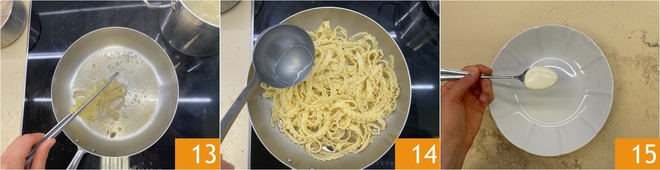 Gießen Sie die Nudeln direkt in die Pfanne mit der Butter 13 und beginnen Sie, sie zu vermengen, indem Sie eine Kelle Kochwasser hinzufügen, um die Sauce gut zu binden 14, so dass Sie eine cremige und umhüllende Konsistenz erhalten. Zum Anrichten geben Sie ein paar Esslöffel Parmesan-Fondue auf den Tellerboden 15.