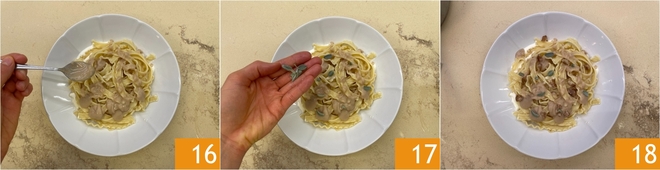 Legen Sie die Nudeln darauf und vervollständigen Sie das Gericht mit ein paar Löffeln Kastaniensauce 16. Verfeinern Sie das Gericht mit frischen Salbeiblättern 17 und den beiseite gehaltenen zerbröckelten vorgekochten Kastanien. Ihre warmen Nudeln mit Kastanien und Parmesan-Fondue sind servierbereit 18!