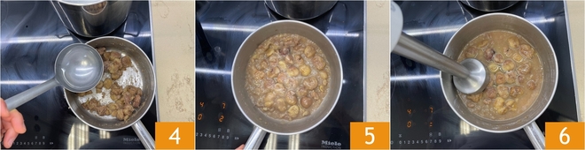Behalten Sie ein paar Kastanien für die endgültige Dekoration beiseite, während Sie die anderen mit ein paar Kellen heißem Wasser 4 begießen, leicht salzen und weitere 5 Minuten kochen lassen, bis sie weich sind 5. Dann alles mit einem Stabmixer pürieren 6.