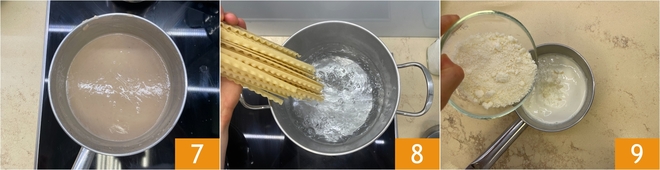 Sie sollten eine glatte und samtige Creme erhalten 7, die Sie dann beiseite stellen. In der Zwischenzeit bringen Sie einen Topf mit gesalzenem Wasser zum Kochen und kochen die Nudeln al dente 8. In der Zwischenzeit widmen Sie sich dem Fondue: Erhitzen Sie die Sahne in einem kleinen Topf, ohne sie zum Kochen zu bringen. Wenn sie heiß ist, schalten Sie die Hitze aus und fügen Sie den geriebenen Parmesan Reggiano hinzu 9.