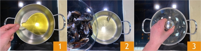 Um die Pasta mit Kichererbsen und Muscheln zuzubereiten, beginnen Sie mit dem Kochen der Muscheln: Erhitzen Sie etwas Öl in einem Topf mit der ganzen, geschälten Knoblauchzehe 1, geben Sie die gereinigten Muscheln hinzu 2, decken Sie den Topf ab 3 und kochen Sie bei hoher Hitze für 5-8 Minuten, bis sie sich öffnen.<\/p>