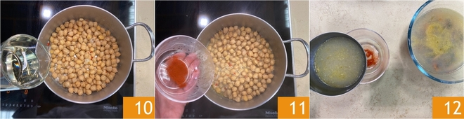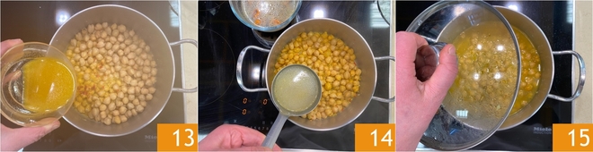 Fügen Sie diese Flüssigkeit zu den Kichererbsen hinzu 13 zusammen mit einem weiteren Schöpflöffel Muschelwasser. Es ist nicht notwendig, zu salzen, da das Muschelwasser für die richtige Salzgehalt sorgt. Decken Sie den Topf ab 15 und kochen Sie 5-10 Minuten. In der Zwischenzeit bringen Sie 500 g Wasser zum Kochen, um die Pasta zu garen.<\/p>