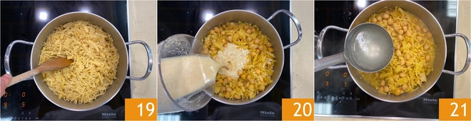 Mischen Sie 19 und integrieren Sie auch die Kichererbsencreme 20. Befeuchten Sie das Ganze mit einem Schöpflöffel des Wassers, das Sie zum Kochen gebracht haben, um die Pasta zu kochen 21.<\/p>