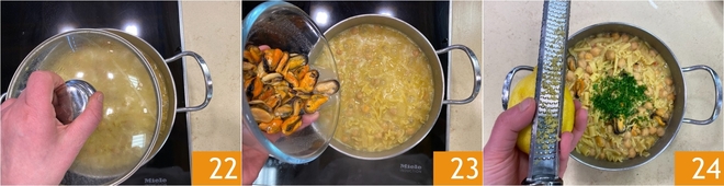 Decken Sie den Topf ab und garen Sie die Pasta, indem Sie nach und nach Wasser hinzufügen, wie bei einem Risotto 22. Eine Minute vor Ende der Garzeit fügen Sie die geschälten Muscheln hinzu 23. Mischen Sie gut und nehmen Sie den Topf vom Herd: Beenden Sie das Gericht mit gehackter Petersilie und der geriebenen Zitronenschale 24.<\/p>