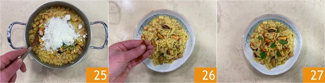 Mischen Sie mit geriebenem Pecorino 25, mischen Sie gut und servieren Sie die Pasta mit Kichererbsen und Muscheln heiß mit Pulver-Chili nach Geschmack 26 und frischer Petersilie 27.<\/p>
