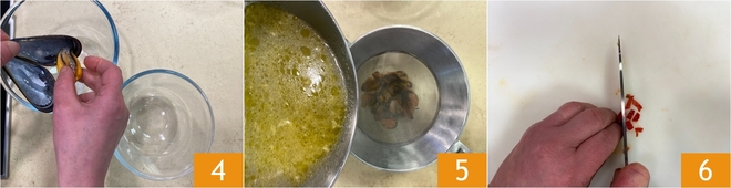 Sobald sie sich geöffnet haben, schälen Sie sie 4. Filtern Sie das Kochwasser und gießen Sie es über die Muscheln, damit sie nicht austrocknen 5. Nun hacken Sie die frische Chili 6.<\/p>