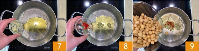 In demselben Topf, in dem Sie die Muscheln gekocht haben, geben Sie einen weiteren Schuss Öl hinzu, eine gehackte Knoblauchzehe 7 und die frische Chili 8. Lassen Sie diese ein paar Minuten anbraten, dann geben Sie die vorgekochten Kichererbsen hinzu 9 und braten Sie sie kurz an.<\/p>