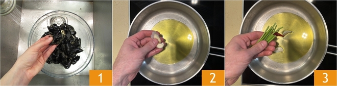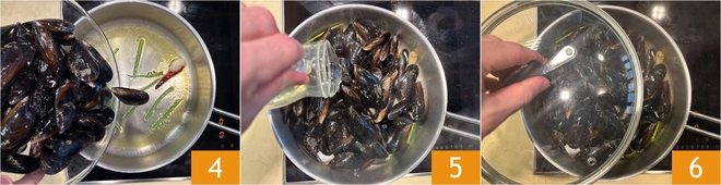 Gebt die Miesmuscheln hinzu 4, löscht mit Weißwein ab 5 und lasst den Alkohol verdampfen, dann deckt mit einem Deckel ab 6. Kocht etwa 5 Minuten auf hoher Hitze, damit sie sich öffnen.
