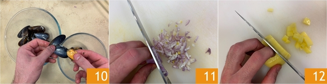 Schält die Miesmuscheln und stellt sie beiseite 10. Macht euch an den Rest der Zutaten: Schält die Schalotte und hackt sie 11. Schält die Kartoffeln und schneidet sie in 1 cm große Würfel 12.