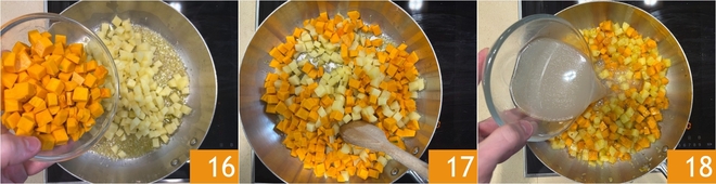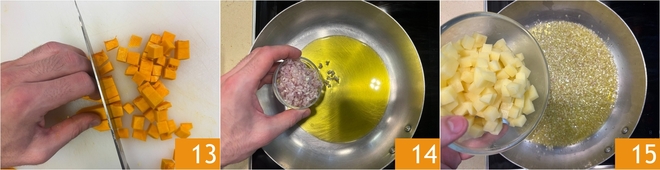 Reinigt den Kürbis und schneidet ihn in 1 cm große Würfel 13. Erhitzt das Öl in der Pfanne, fügt die Schalotten hinzu 14 und lasst sie einige Minuten weich werden. Wenn sie weich und durchsichtig sind, fügt die Kartoffeln hinzu 15.