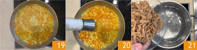 Kocht 10 Minuten bei mittlerer Hitze 19, dann salzt 20. Kocht die gemischte Vollkornpasta in leicht gesalzenem kochendem Wasser 21.
