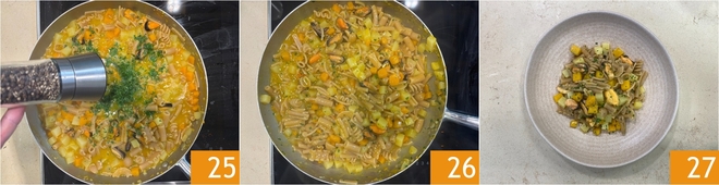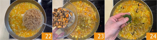 Pfeffert 25 und schwenkt mit dem Olivenöl, dann rührt ein letztes Mal um 26. Serviert sofort eure Pasta mit Kürbis, Kartoffeln und Miesmuscheln 27!