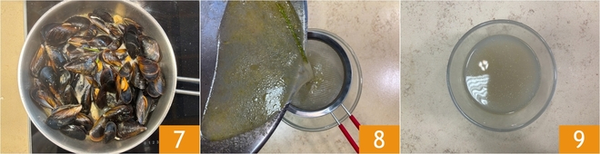 Sobald sie geöffnet sind 7, gießt die Miesmuscheln ab 8 und bewahrt deren Kochflüssigkeit auf 9.