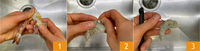 Um die Pasta mit Riesengarnelen zuzubereiten, reinigen Sie zuerst die Krustentiere: Entfernen Sie den Kopf 1 und den Panzer 2 und legen Sie sie beiseite, dann entfernen Sie den Darm, indem Sie einen Schnitt am Rücken machen 3.