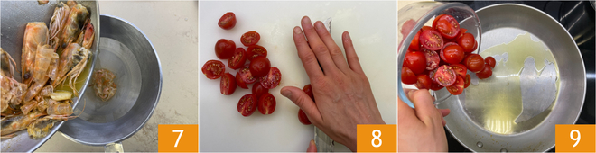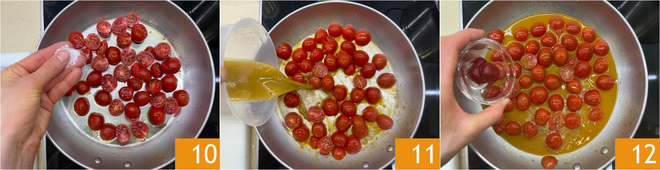 Wenn der gesamte Alkohol verdampft ist, filtern Sie den Kochfonds durch ein feines Sieb 7. Schneiden Sie die Kirschtomaten in Hälften 8 und geben Sie sie in dieselbe Pfanne unter Zugabe von etwas Öl 9.