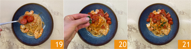 Fügen Sie noch etwas Soße hinzu 19 und gehackte Petersilie nach Belieben 20. Ihre Pasta mit Riesengarnelen ist bereit zum Servieren 21!