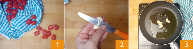 Um die Fusilli mit Thunfisch und Kirschtomaten vorzubereiten, bereiten Sie zunächst die Sauce vor. Waschen, trocknen und halbieren Sie die Kirschtomaten 1. Schälen Sie den Knoblauch, teilen Sie ihn in zwei Hälften und entfernen Sie den inneren Kern 2. Geben Sie die Knoblauchzehen in eine Pfanne mit einem Schuss Öl und lassen Sie sie anbraten 3.