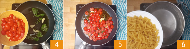 Fügen Sie einen Teil der zerkleinerten Basilikumblätter von Hand hinzu und geben Sie die Kirschtomaten dazu 4, mit einer Prise feinem Salz. Kochen Sie die Kirschtomaten, bis sie weich sind und ihren Saft freigeben, das dauert etwa 10 Minuten 5. Danach können Sie den Knoblauch entfernen. In der Zwischenzeit kochen Sie die Fusilli in reichlich kochendem Salzwasser nach Belieben 6.