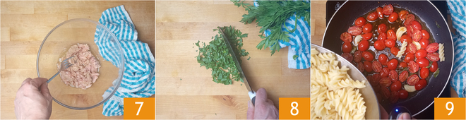 Geben Sie den Thunfisch in eine Schüssel und zerdrücken Sie ihn mit einer Gabel 7. Dann hacken Sie die Petersilie 8 und zerkleinern Sie die Basilikumblätter von Hand. Sobald die Pasta gekocht ist, lassen Sie sie abtropfen und geben Sie sie in die Pfanne mit den Kirschtomaten 9.