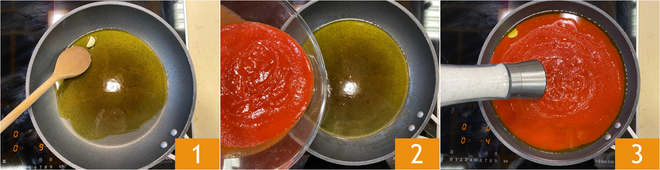 Um die Pasta nach Pizzaiola-Art zuzubereiten, lassen Sie zunächst eine Knoblauchzehe mit einem Schuss Öl in einer Pfanne anbraten 1. Gießen Sie das Tomatenpüree hinein 2, salzen 3 und pfeffern Sie.