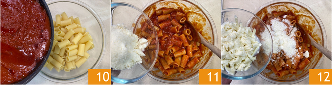 Gießen Sie die Sauce in die Schüssel mit der Pasta 10 und mischen Sie, um sie gleichmäßig zu würzen. Fügen Sie die Hälfte des geriebenen Parmigiano Reggiano 11 und die Hälfte des zerrissenen Mozzarellas 12 hinzu.