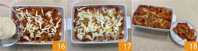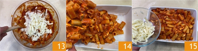 Gut mischen 13, dann die so gewürzte Pasta in eine Auflaufform geben 14. Verteilen Sie den restlichen Mozzarella auf der Oberfläche 15.