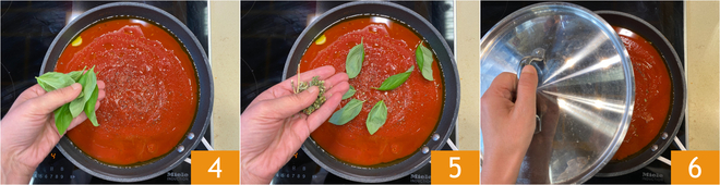 Aromatisieren Sie mit frischem Basilikum 4 und getrocknetem Oregano 5, dann decken Sie mit einem Deckel ab 6 und lassen Sie es bei schwacher Hitze etwa 30 Minuten köcheln.