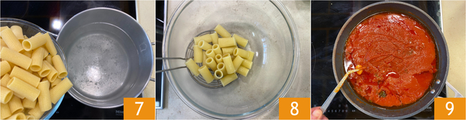 Gegen Ende der Kochzeit kochen Sie die Pasta in kochendem Salzwasser 7. Die Pasta sehr bissfest abgießen und in eine Schüssel geben 8. Zu diesem Zeitpunkt wird die Sauce gekocht sein, also die Hitze ausschalten und den Knoblauch entfernen 9.