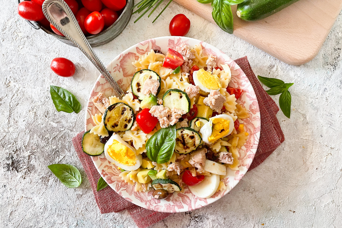 Die Kalter Nudelsalat ist eines der Sommergerichte, die wir am meisten lieben. Es gibt so viele Varianten von kalten Pastagerichten, alle köstlich und originell. Heute stellen wir Ihnen eine einfache, aber schmackhafte Version vor: kalte Pasta mit Thunfisch. Ein einfaches Gericht, das man mit den Zutaten, die man zu Hause hat, personalisieren und bequem auf Ausflüge oder zur Arbeit mitnehmen kann. Für diese Pasta haben wir neben Thunfisch auch gegrillte Zucchini, zarte Avocadowürfel, Kirschtomaten, Oliven, hartgekochte Eier und viele aromatische Kräuter hinzugefügt, die einen köstlichen Duft verleihen. Natürlich können Sie all diese Zutaten je nach Ihrem Geschmack variieren und so ein immer anderes Gericht kreieren, das Sie mit der ganzen Familie teilen können!
