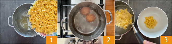 Um die kalte Pasta mit Thunfisch zuzubereiten, kochen Sie zunächst die Farfalle in kochendem Salzwasser 1. In der Zwischenzeit die Eier in einem kleinen Topf kochen, beginnend mit kaltem Wasser, und 7 Minuten kochen lassen, nachdem das Wasser zu kochen beginnt 2. Sobald die Pasta al dente ist, geben Sie sie in eine große Schüssel 3.