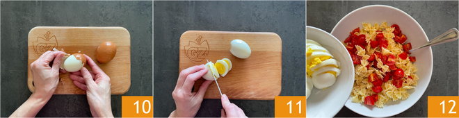 Nehmen Sie nun die Eier und schälen Sie sie 10. Schneiden Sie sie in Scheiben 11, oder wenn Sie möchten, in Viertel. Wenn die Pasta kalt ist, fügen Sie die Kirschtomatenstücke und die hartgekochten Eier hinzu 11.