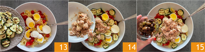 Fügen Sie auch die gegrillten Zucchini 13, den gut abgetropften Thunfisch 14 und die Oliven 15 hinzu.