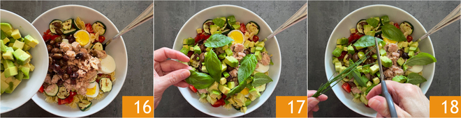 Fügen Sie die Avocado 16 und die Basilikumblätter hinzu 17, wenn Sie möchten, können Sie sie mit den Händen zerkleinern. Schneiden Sie den Schnittlauch hinein, indem Sie eine Schere verwenden 18.