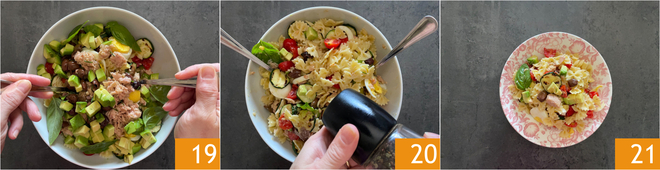 Mischen Sie gut 19, würzen Sie mit Salz und Pfeffer 20. Fügen Sie einen schönen Schuss Öl hinzu und mischen Sie erneut. Stellen Sie die kalte Pasta mit Thunfisch bis zum Servieren in den Kühlschrank 21.