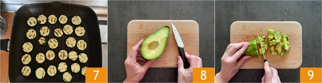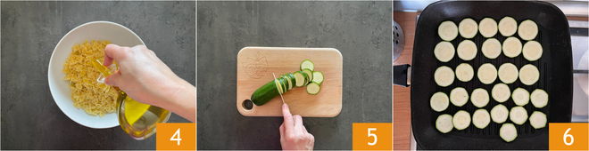 Würzen Sie sie mit einem Schuss Öl 4, mischen Sie sie und lassen Sie sie abkühlen. Nach 7 Minuten die Eier abgießen und unter fließendem Wasser abkühlen. Gehen Sie zu den Zucchini: Waschen Sie sie gründlich und schneiden Sie sie in Scheiben 5. Erhitzen Sie einen Grill und legen Sie die Zucchinischeiben darauf 6.
