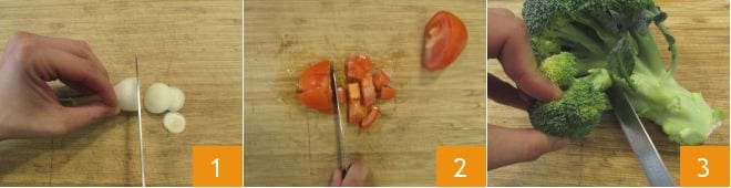 Um die Nudelsuppe mit Kichererbsen und Brokkoli zuzubereiten, beginnen Sie damit, den weißen Teil der Frühlingszwiebel in Ringe zu schneiden 1, waschen Sie dann die Tomate und schneiden Sie sie in mittelgroße Würfel 2. Nehmen Sie die Röschen vom Brokkoli 4 und spülen Sie sie ab.
