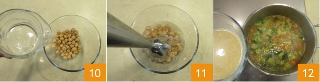 In einer separaten Schüssel geben Sie die restlichen 200 g Kichererbsen und die beiseite gestellten 100 g Wasser 10, dann pürieren Sie alles mit einem Stabmixer 11. Nach den 10 Minuten Kochzeit der Suppe geben Sie das so erhaltene Kichererbsenpüree hinzu 12.