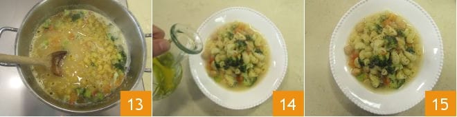Lassen Sie alles weitere 5-8 Minuten kochen, wobei Sie das Lorbeerblatt entfernen, bevor Sie die Nudeln hinzufügen und sie 5 Minuten kochen lassen 13. Rühren Sie gelegentlich um und servieren Sie Ihre Suppe, sobald sie fertig ist, mit einem weiteren Schuss Öl für jeden Teller 14. Die Nudelsuppe mit Kichererbsen und Brokkoli ist bereit, heiß genossen zu werden 15!