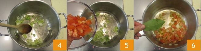 In einem großen Topf geben Sie einen Schuss Öl und lassen Sie die Frühlingszwiebel bei schwacher Hitze anbraten, dabei häufig mit einem Holzlöffel umrühren 5. Nach etwa 1 Minute können Sie die Tomatenwürfel 6 und das Lorbeerblatt (frisch oder getrocknet) 6 hinzufügen,