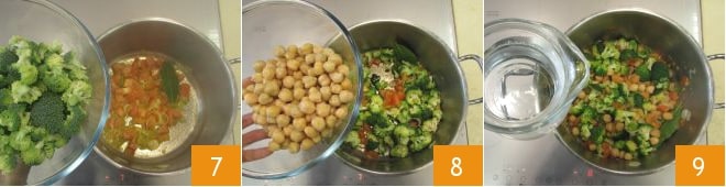 die Brokkoliröschen 7 und 200 g vorgekochte Kichererbsen, abgetropft vom Konservierungswasser 8. Rühren Sie alles um und kochen Sie es bei mittlerer Hitze: Nach ein paar Minuten fügen Sie Wasser hinzu, wobei Sie nur 100 g der gesamten Menge beiseite lassen 9. Salzen Sie nach Belieben und lassen Sie die Suppe bei mittlerer Hitze etwa 10 Minuten kochen.