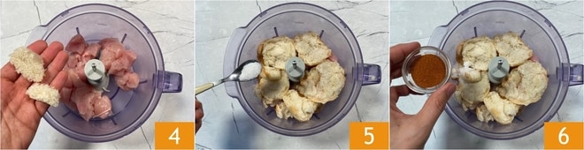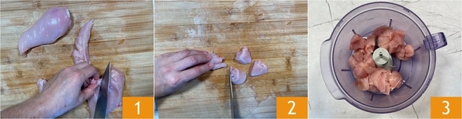 Um die Nuggets in der Heißluftfritteuse zuzubereiten, beginnen Sie damit, die Hähnchenbrust von kleinen Knochen und Fett zu reinigen 1. Schneiden Sie sie, sobald sie gereinigt ist, in 3-Zentimeter-Stücke 2 und geben Sie sie in einen Mixer mit Klingen 3.