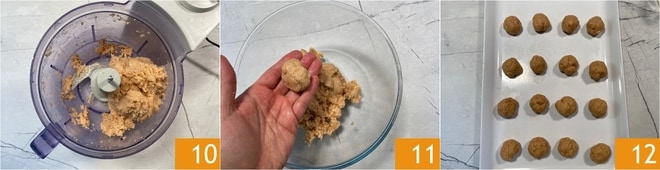 Mixen Sie alles, bis sich die Mischung von den Wänden löst 10 und homogen ist. Nehmen Sie mit feuchten Händen 20 Gramm der Mischung 12, formen Sie Kugeln und legen Sie sie auf ein Tablett 12. Mit diesen Mengen erhalten Sie 16 Nuggets.