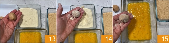 Rollen Sie jede Kugel zuerst in Hartweizengrieß 13, lassen Sie den Überschuss abfallen 14. Dann tauchen Sie sie in verquirlte Eier 15.