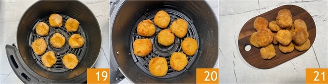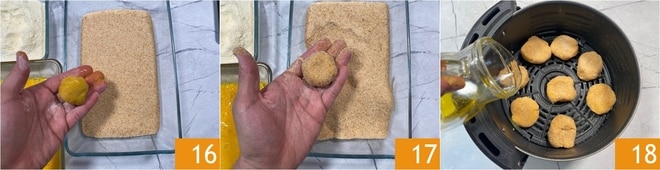 Wälzen Sie sie im Paniermehl 16, dann geben Sie ihnen die klassische Form, indem Sie sie mit den Händen formen 16. Legen Sie die Nuggets in den Korb der Heißluftfritteuse und geben Sie das restliche Extra-Native-Olivenöl hinzu 19.