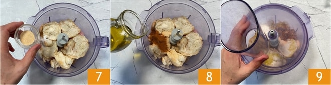 Geben Sie auch das Zwiebelpulver 7 und den Knoblauch dazu. Gießen Sie das Extra-Native-Olivenöl 8 hinzu und schließen Sie den Mixer mit seinem Deckel 9.