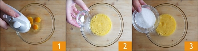 Um den Nutella-Gugelhupf vorzubereiten, beginnen Sie damit, die Eier mit einem elektrischen Handrührgerät aufzuschlagen 1, etwa 3 Minuten lang. Wenn sie schaumig sind, fügen Sie eine Prise Salz 2 und den Zucker 3 hinzu.