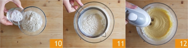 Geben Sie das Backpulver in das Mehl 10 und mischen Sie. Sieben Sie die Hälfte der trockenen Zutaten in die Mischung 11 und rühren Sie weiter mit den elektrischen Rührgeräten, bis sie gut aufgenommen sind 12.
